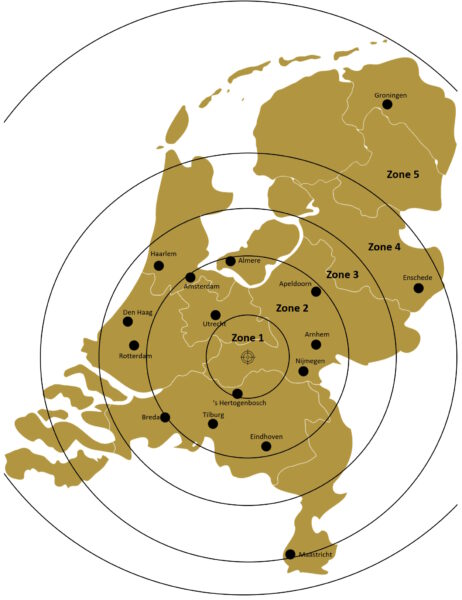 Zie zone kaart voor de indeling van de 5 zones (kaart is ter indicatie, bezorgkosten getoond in webshop zijn leidend):