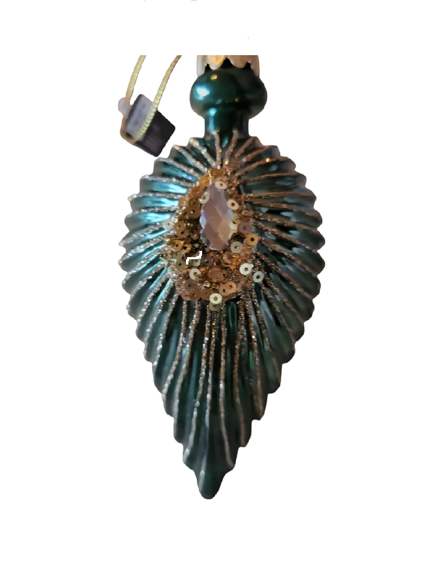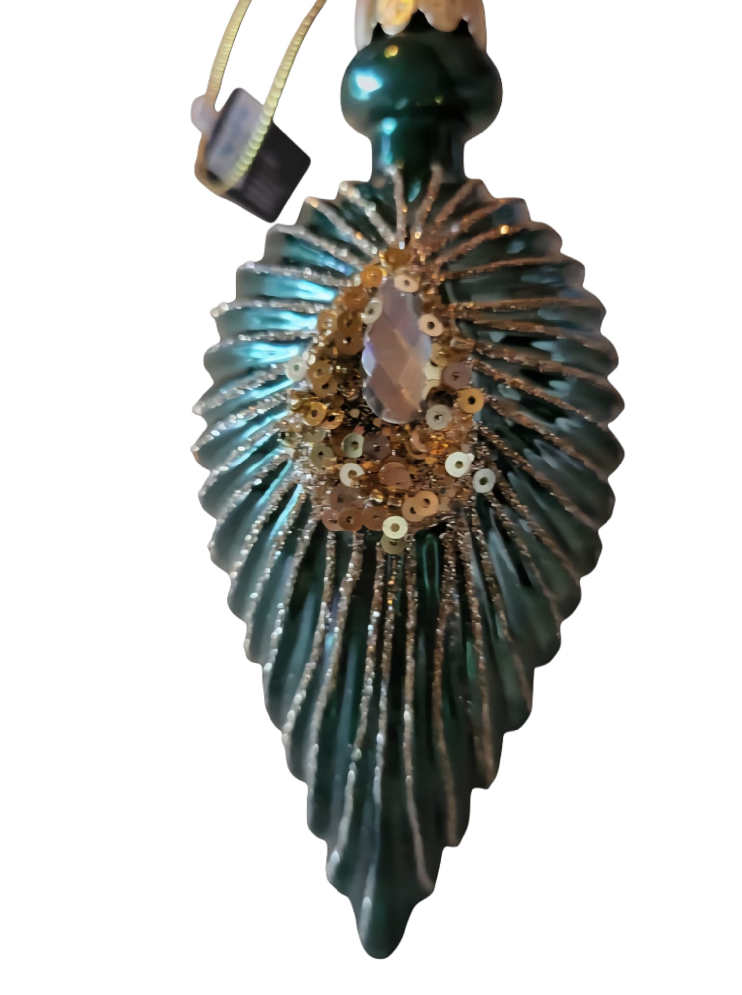 Deze donkergroene kerstbal in druppelvorm straalt luxe en elegantie uit. De verfijnde gouden details benadrukken de rijke kleur, terwijl de diamantensteen in het midden zorgt voor een schitterend middelpunt. Een stijlvolle blikvanger voor in de kerstboom of als onderdeel van een feestelijke decoratie. Perfect voor wie houdt van een klassieke en chique kerstsfeer.