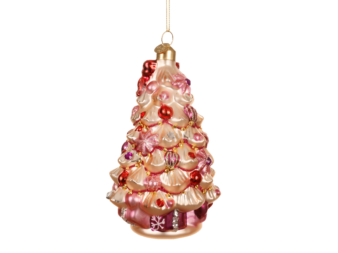 Laat je kerstboom schitteren met deze unieke glazen kersthanger in de vorm van een feestelijk versierde kerstboom. De warme tinten roze, rood en goud zorgen voor een speels én stijlvol effect, perfect voor wie houdt van een kleurrijke en elegante kerst.