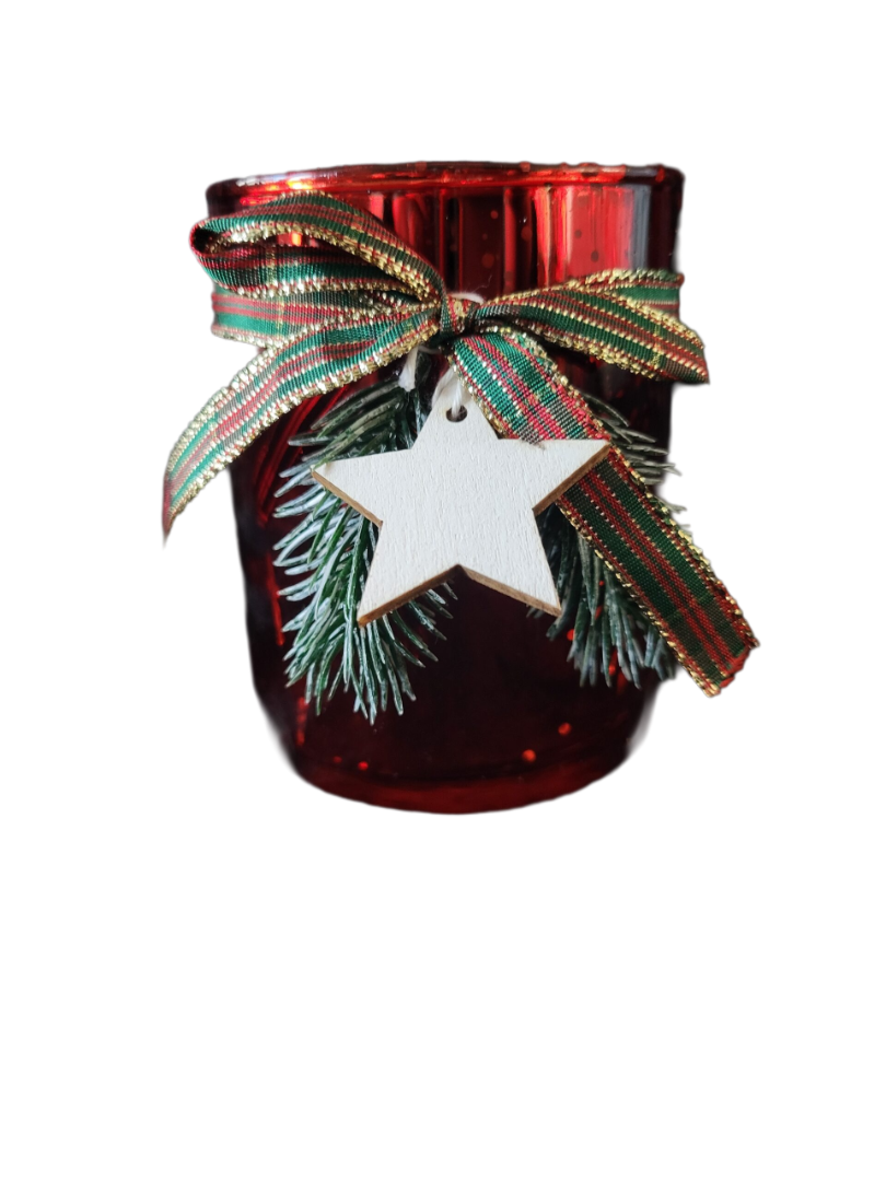 Deze rode sfeerlichthouder brengt direct warmte en gezelligheid in huis. Het glanzende glas wordt stijlvol afgewerkt met een klassiek kerstlint, een dennentakje en een houten ster. Ideaal als decoratie tijdens de feestdagen of als sfeervol geschenk.