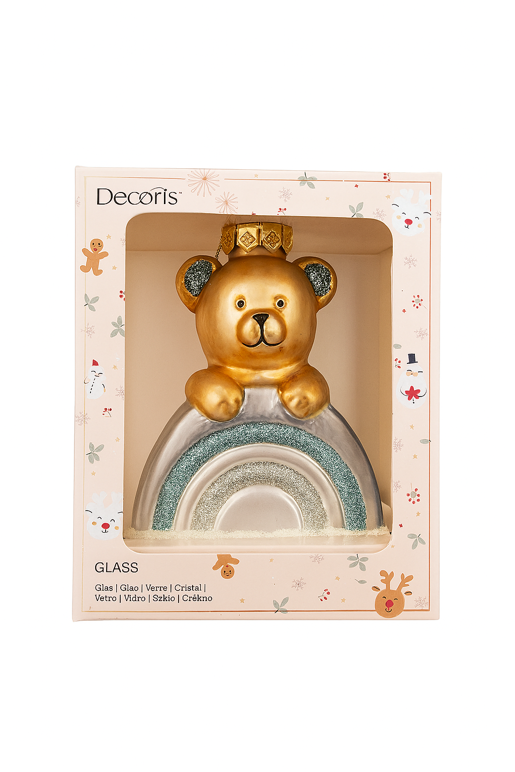 Breng warmte en magie in je kerstboom met dit betoverende glazen kerstornament van Decoris. Het schattige gouden beertje, zittend op een glinsterende regenboog, straalt luxe en vrolijkheid uit. Met zijn fijne details, glitteraccenten en elegante afwerking is dit ornament een absolute eyecatcher voor de feestdagen.