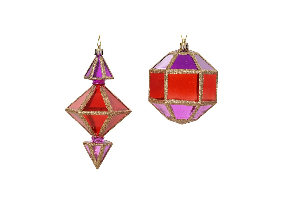 Geef je kerstboom een moderne en feestelijke touch met dit unieke kerstornament. Het ornament is uitgevoerd in opvallende kleurencombinaties van rood en paars, afgewerkt met glinsterende gouden glitterranden. Dankzij het lichte materiaal hangt het moeiteloos in elke boom.