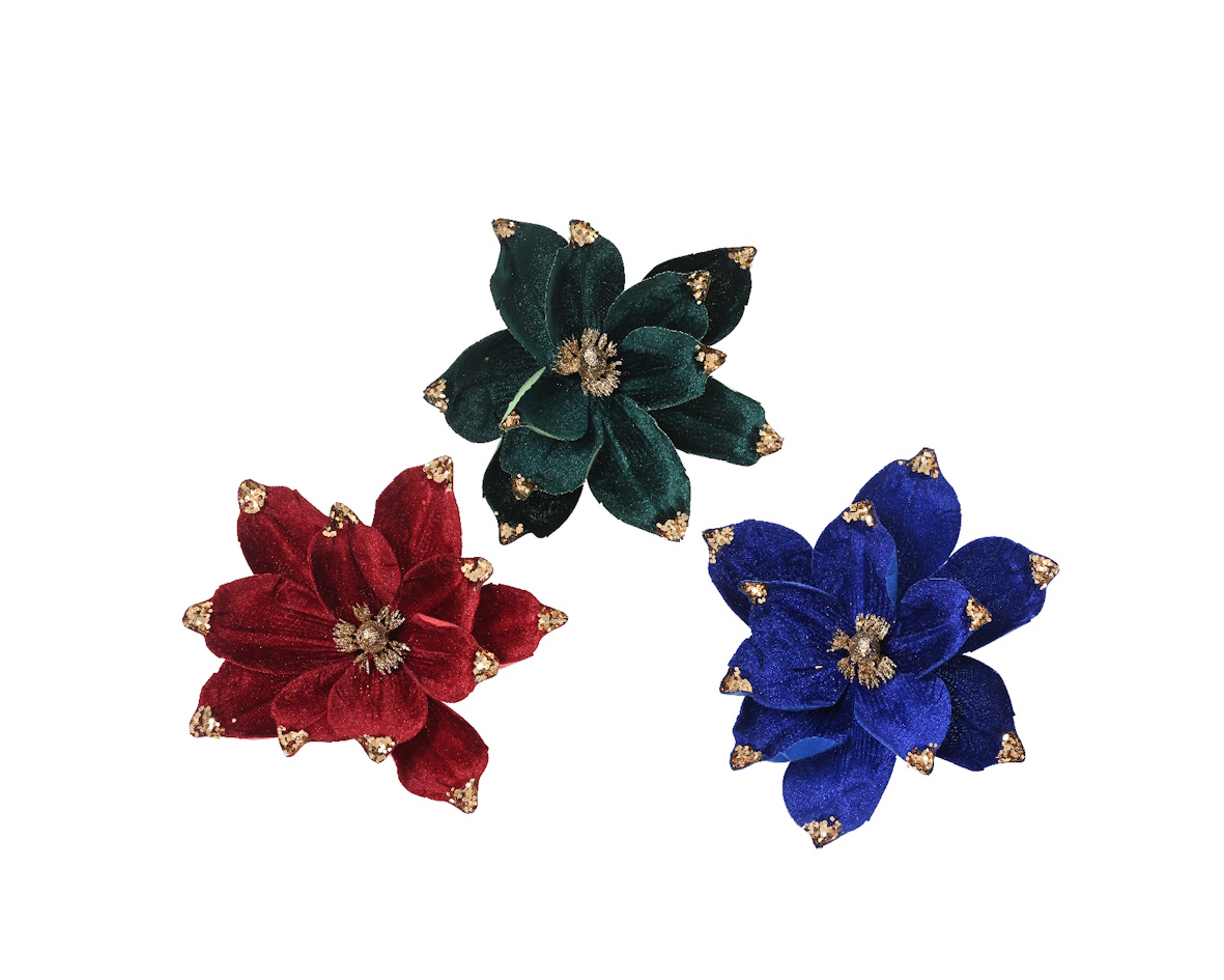 Geef je kerstboom, krans of feesttafel een elegante en feestelijke touch met deze prachtige fluwelen kerstbloem. De bloem is rijk afgewerkt met gouden glitters aan de bladpunten en in het hart, en heeft een stevige clip aan de achterkant om eenvoudig te bevestigen waar jij wilt.