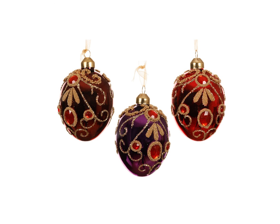 Deze sierlijke glazen ei-ornamenten brengen direct klasse in je kerstdecoratie. Met de hand versierd met goudkleurige glitters, filigraan patronen en fonkelende rode edelsteen-accenten. Verkrijgbaar in drie rijke kleuren: bordeauxrood, koninklijk paars en helder rood.