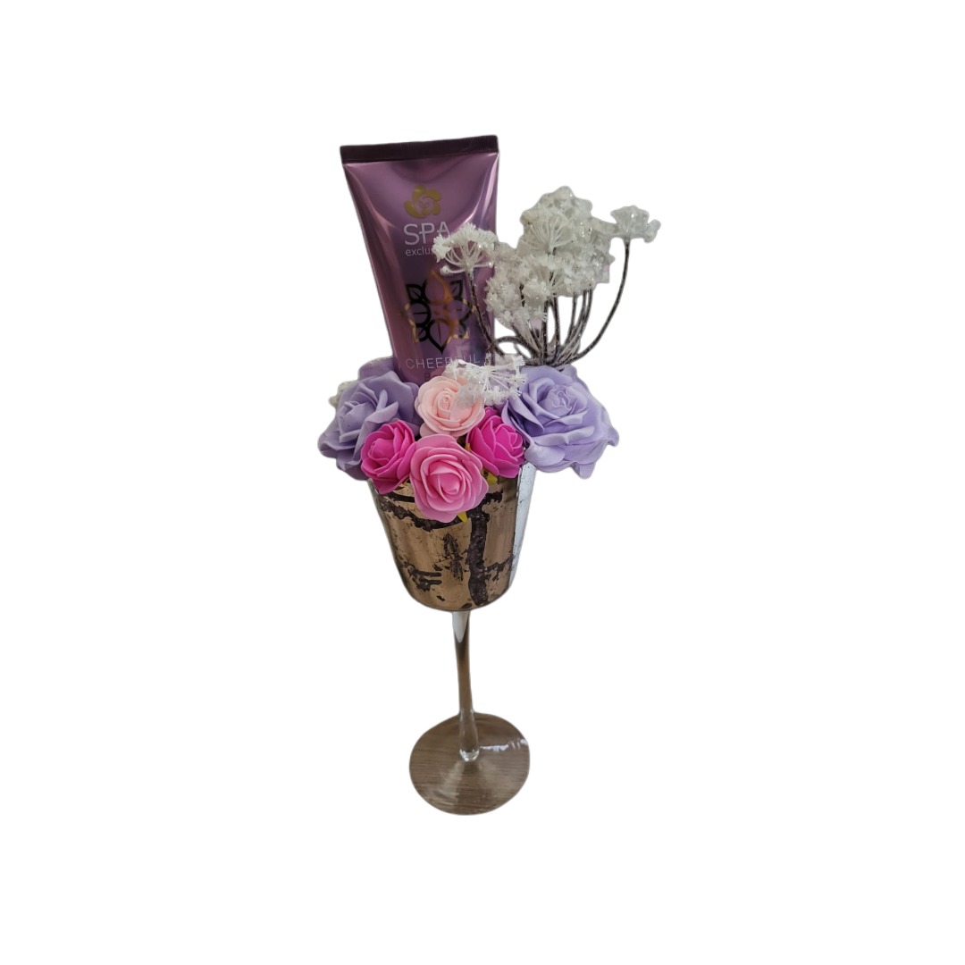Op zoek naar een origineel en stijlvol cadeautje? Deze handgemaakte decoratie in een luxe gouden beker is een echte blikvanger! Gevuld met zijdezachte kunstrozen in roze- en paarstinten, een elegante witte bloem en een verzorgende douchegel, is dit het perfecte cadeau voor elk moment van verwennerij.