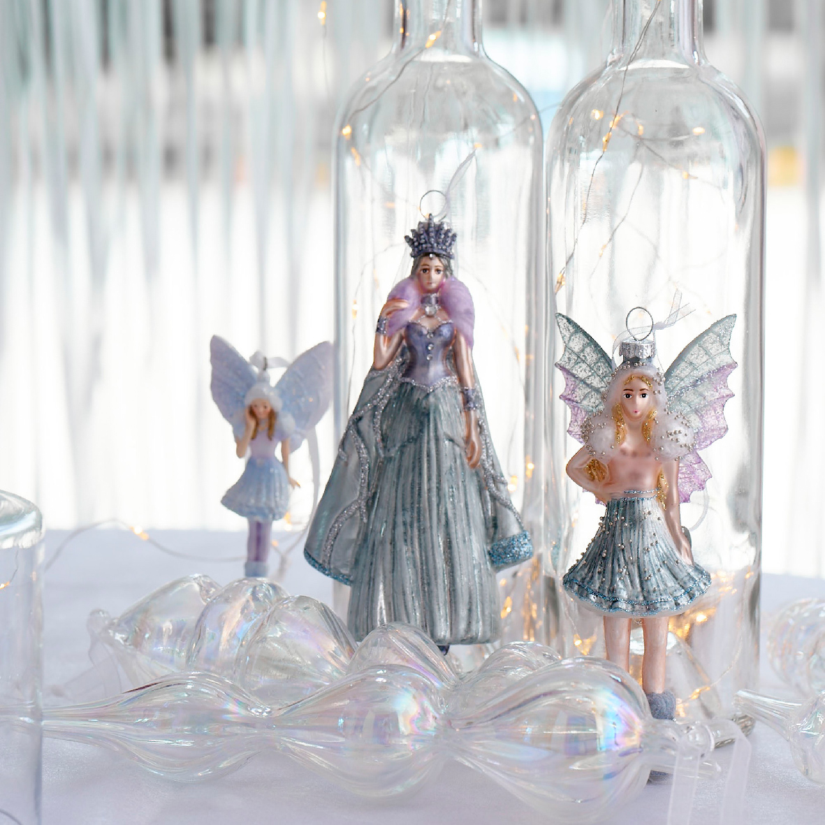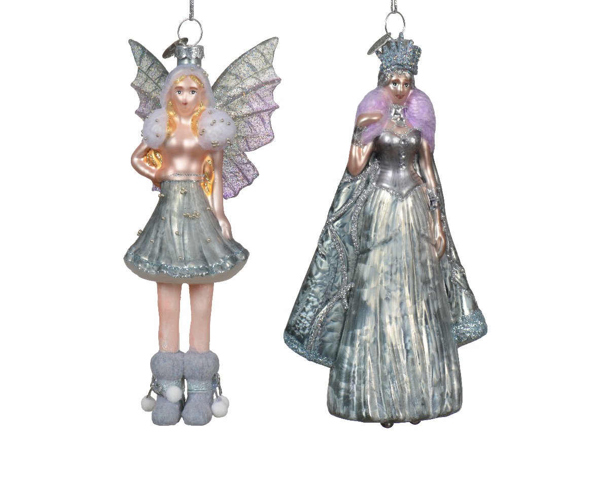 Laat magie en elegantie samenkomen in je kerstboom met de Winter Royalty glazen kerstornamenten. Kies uit twee unieke figuren: een stijlvolle sneeuwprinses met glittercape en kroon, of een sprankelende winter elf met vleugels en Imitatiebont schoenen. Elk ornament is handgedecoreerd en straalt luxe en fantasie uit – perfect voor een sprookjesachtige kerstsfeer.